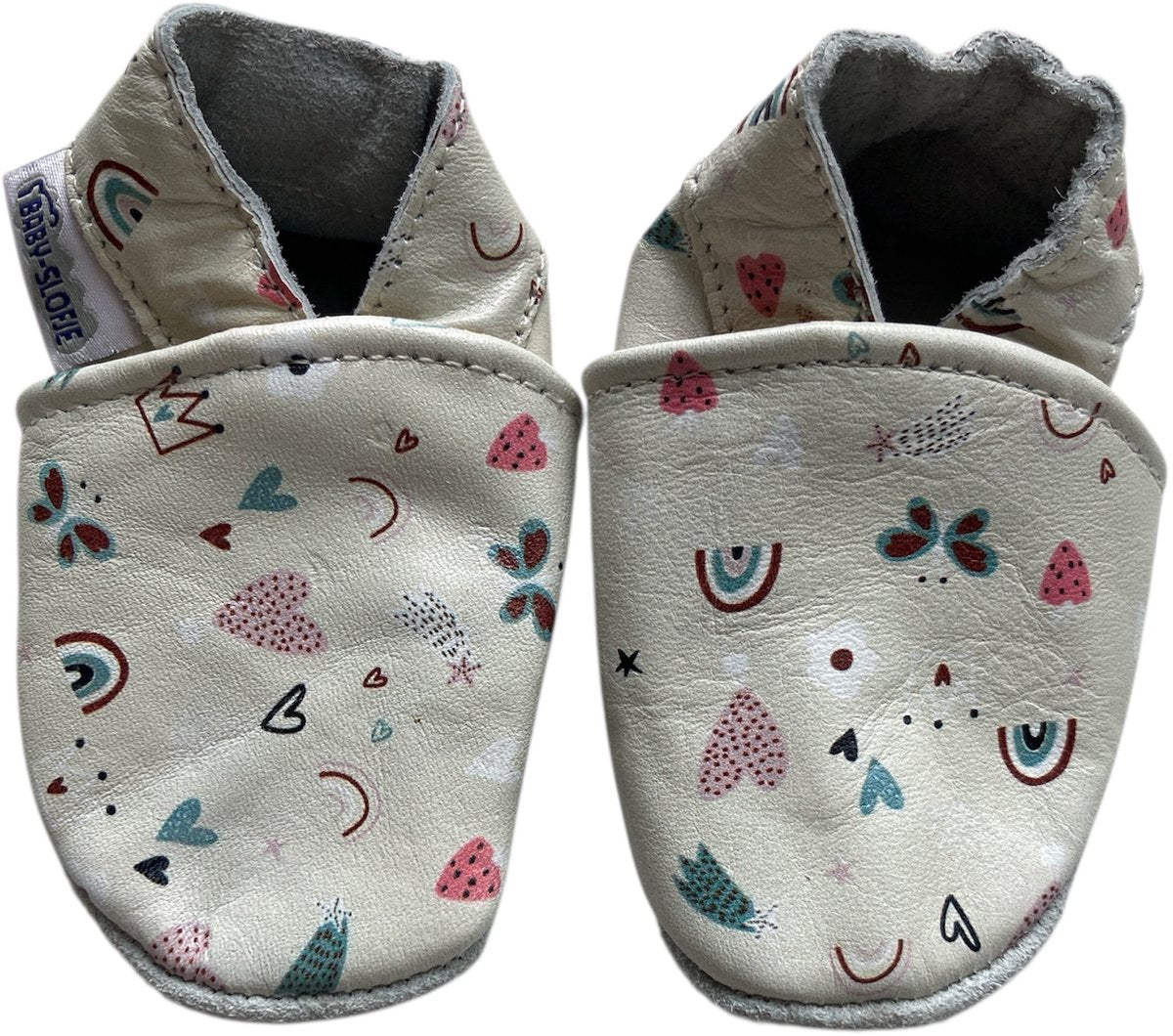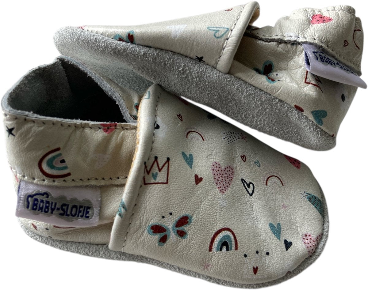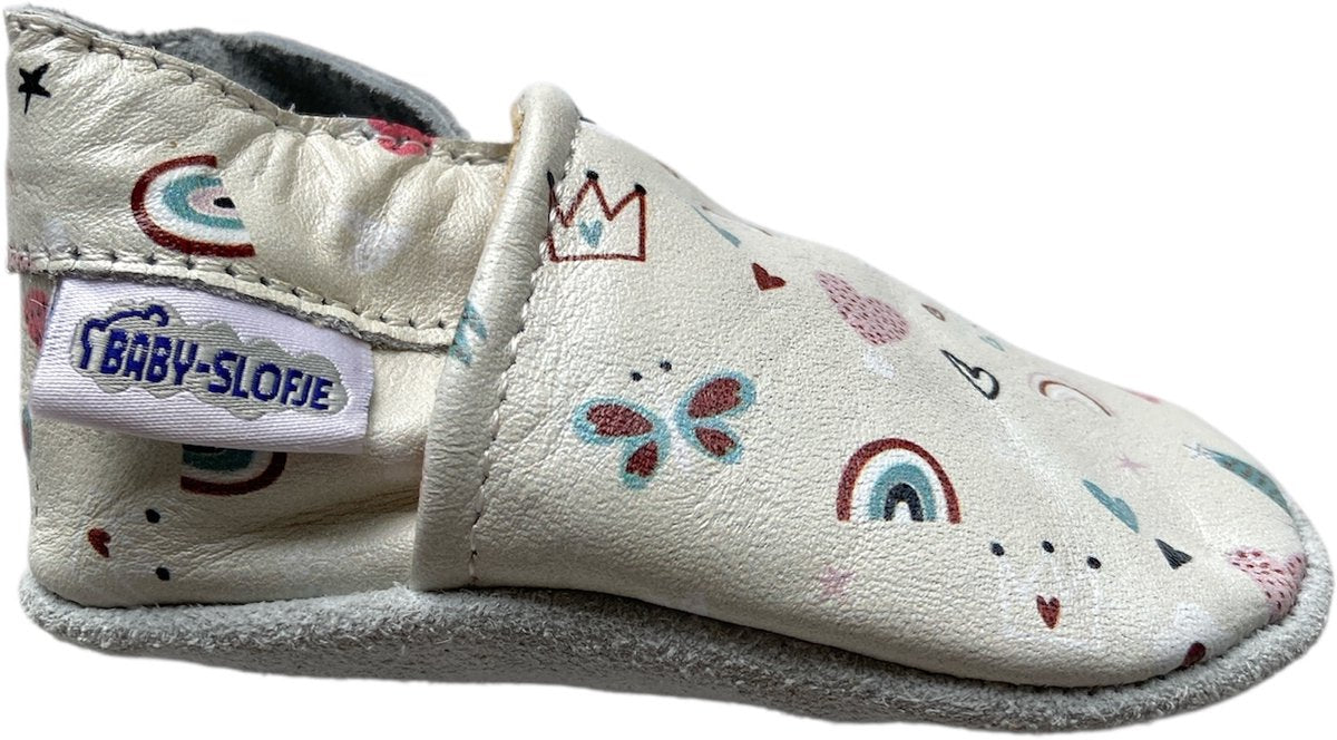 Vrolijk bedrukte leren babyslofjes van Baby-Slofje