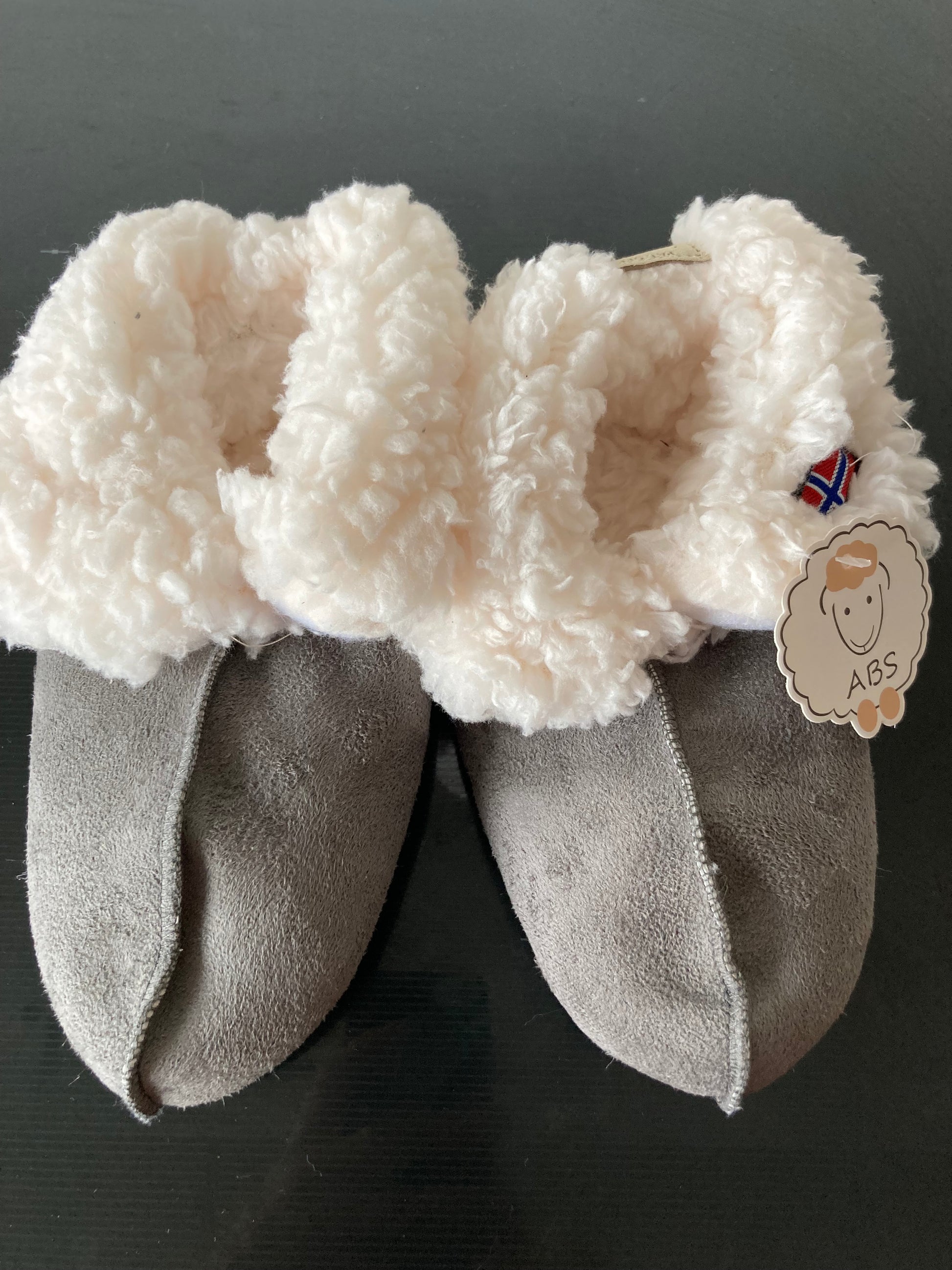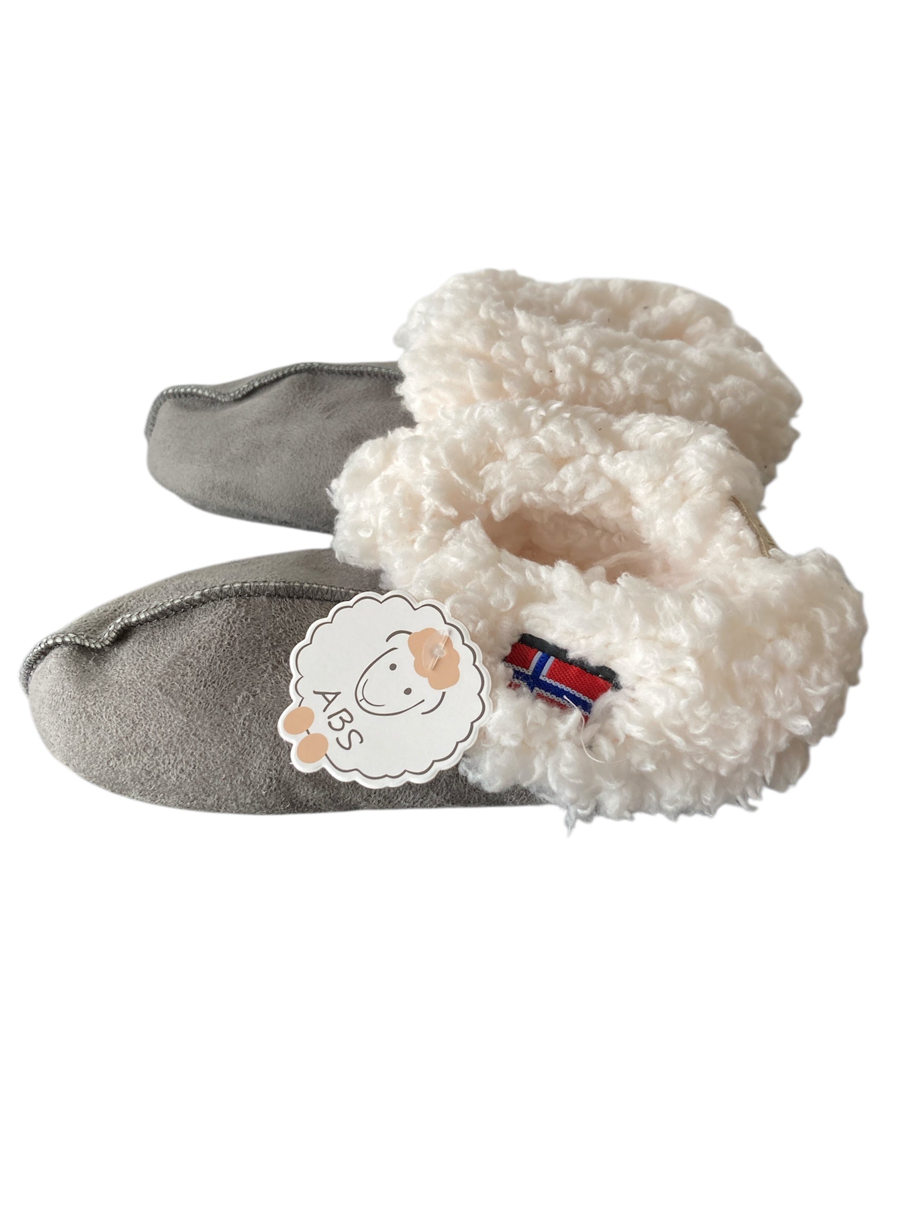 Aan de slofjes hangt een label met een schattig schaapje en de tekst “ABS”, wat erop wijst dat de zool antislip eigenschappen heeft.